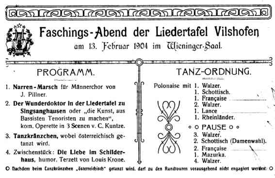 1846 Gründung der Liedertafel 1869 Symphonie ‑ Ode „Die Wüste“ Felicien David 1870 Symphonie ‑ Ode „Columbus“ Felicien David 1871 Komische Operette „Die Mordgrundbruck“ von Julius Otto 1874 Stücke von Beethoven, Mozart, Mendelssohn, Spohr, Marschner und Nicolai das Melodram Columbus von Becker. 1876 Schillers „Glocke“ von Andreas Romberg 1878 Die Operette „Der Taucher von Sturm“ und das Lustspiel „Der Nachtwächter“ von Körner 1882 Theaterabende „Tante Kobold und Onkel Satanas“ Lustspiel von C. Görner, sowie „Leonore oder die Vermählung am Grabe“ von Holtei 1890 Das lustige Singspiel „Der Trompeter von Krächzingen“ von Ernst Simon 1891 „Eine Sängerfahrt auf dem Rheine“ Zyklus in 12 Gesängen von W. Tschirsch 1901 Schwank „Gemeinderatssitzung in Albernhausen“ 1902 „Die Schlacht im Teutoburger Walde“ Llyrisch‑romantisch Oper von V. Becker 1906 Die Operette „Der Mohr in Venedig“ von Karl Höpfner 1911 Komische Szenen „Die verhängnisvolle Nachtwache“, „Eine ländliche Konzertprobe“, „Das Duell in der Ahnengruft“ 1912 Singspiel „Zweierlei Tuch“ 1913 Frühjahrskonzert mit Partien aus Kreutzers „Nachtlager von Granada" 1914 Liederzyklus „An der Wolga“ von Hugo Jüngst 1919 Chorwerk „Landerkennung“ von E. Grieg 1920 „Inkognito oder Fürst wider Willen“, komische Operette von Hermann Kipper 1922 „Holledauer Fidel“ von Scherrer – Kutschreuther 1923 „Donau-Lisl“ von Scherrer – Kutschreuther 1925 Rombergs „Glocke“ 1926 „Der Postillon“ von Scherrer – Eckl 1929 Kirchenkonzert mit Werken von Palestrina,Händel, Haydn, Bach 1930 „Der Weg ins Paradies“ Operette von Felix Renker 1931 Geistliches Konzert mit Werken von Palestrina, Kienzl, Schubert, Liszt, Händel 1932 Kirchenkonzert mit Orgel- und Chorvorträgen 1933 „Holledauer Fidel“ von Scherrer – Kutschreuther 1949 Scherrer ‑ Eckls Singspiel „Der Passauer Postillon“ und das "Weihnachtsoratorium" von Heinrich Schütz 1950 Mozarts „Krönungsmesse“ (zum 100jährigen Bestehen) 1953 Oratorium „Stabat Mater“ von Franz Schubert 1955 Luigi Cherubini Requiem in C ‑ Molk (zusammen mit dem Kirchenchor und dem Passauer Konzertverein) 1956 Händels „Messias“ 1961 Joseph Haas „Das Leben Mariens“ Kantate (zus. mit dem Kirchenchor) 1966 „Cäcilien – Ode“ Oratorium von G. E Händel 1971 Carl Orffs „Carmina Burana“ 1972 Änderung des Chornamens auf Antrag des Chorleiters Gerhard Auer in "Singkreis" 1975 Erna Woll, )Feier des Advent<. 1977 „Missa Choralis“ von Franz Liszt 1978 Johannes Brahms „Zigeunerlieder“ 1982 „Missa in honorem Sancti Nicolai“ von Joseph Haydn 1984 Joseph Haydns „Mariazeller Messe“ (mit Kirchenchor St. Maria, München) 1985 Händels „Oettinger Te Deum“ 1987 „Die sieben Worte Jesu am Kreuz“ von Heinrich Schütz 1989 Hans Leo Haßler, „Missa octo vocum“ (zusammen mit den Passauer Blechbläsern) 1991 W. A Mozart, „Vesperae solennes de confessore“ 1992 Johannes Brahms, „Liebesliederwalzer“ 1993 „Paukenmesse“ von Joseph Haydn und „Te Deum“ von Marc‑Antoine Charpentier 1994 "Sommerkonzert" mit Kammerorchester der Uni Passau, Konzertflötenquartett 1996 Melodien aus "My Fair Lady" und "West Side Story" "Requiem in c-Moll" von Luigi Cherubini mit Orchester des Stadttheaters Passau 1997 "Gospel-Mass" mit Erich Maier & Band aus München, Solistin Gerti Schatzlmayr 1998 "Das etwas andere Weihnachtskonzert" mit Münchner Blechschaden, Kollegchor, des Gymnasiums, Erich Maier Band 1999 Konzert mit drei Chören: Coro amici della musica / Kammerchor / Singkreis "Cantate zum Weihnachtsfest" - Komponisten unserer Stadt Habermann, Eberle, Wild, Text: Dr. Hubert Schreiber 2000 "Über allem steht ein Licht" - Geistliches Konzert mir Kammerchor 2001 "Gershwin in Concert" mit Heidelinde Schmid und Combo, Weihnachtskonzert mit Kammerchor 2002 "Sommerserenade" mit Tänzerinnen der Turngemeinde, Weihnachtskonzert mit Kammerchor und Unterstufenchor des Gymnasiums 2003 "Marienlieder" - gestaltete Maiandacht in Schweiklberg und Sandbach 2004 "Missa duodecim vocum" von Felix Eberle in Schweiklberg 2005 "Melodien der 20er Jahre" Weihnachtskonzert 2006 "Te Deum" von Marc-Antoine Charpentier,"Weihnachtskantate"von Franz Habermann